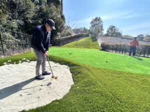 グリーン間近のシーンでは、パークゴルフにおけるバンカーショットにも挑戦。