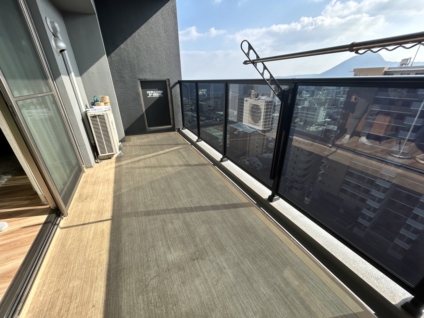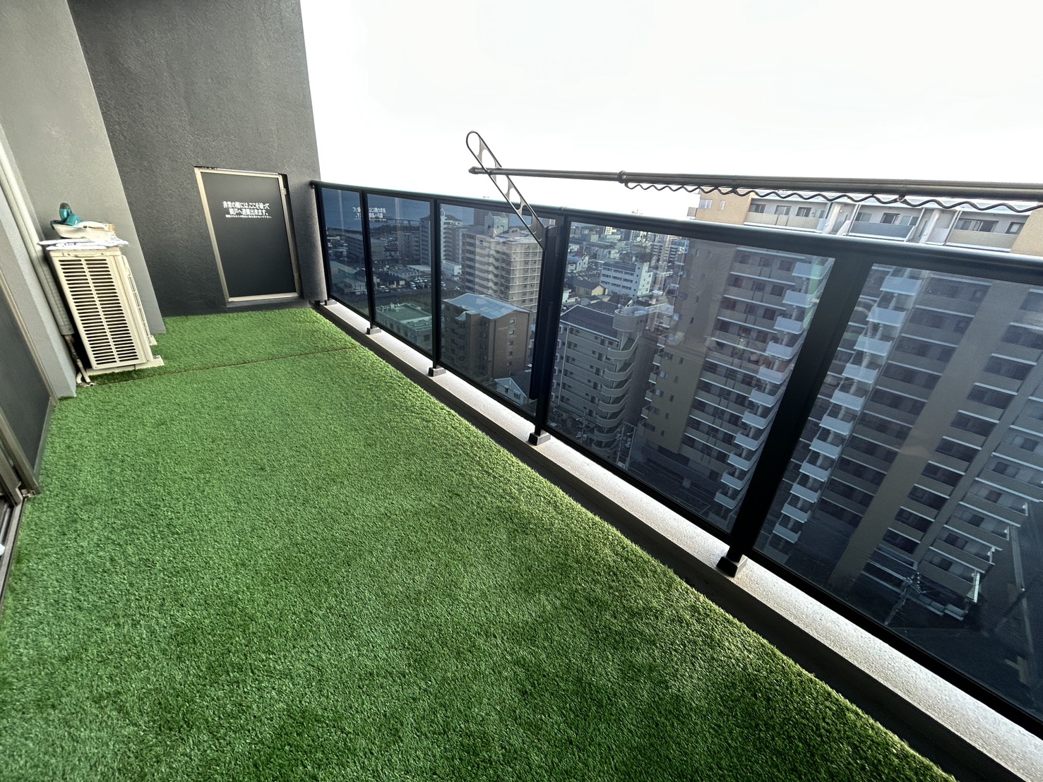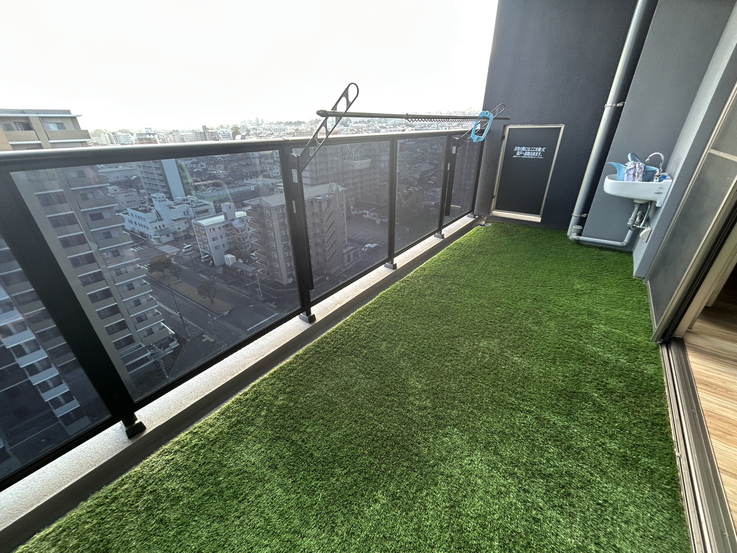 一般住宅別府市内K様邸バルコニー beforebeforeafterafter 別府市内にあるマンションバルコニーにて人工芝を敷かせていただきました。 今回は非充填タイプ(砂・チップは不要)30㎜ショートパイル ペットとの憩いの場にもなっており大変素敵なスペースになっております。